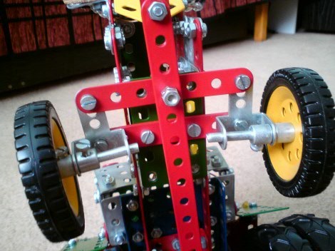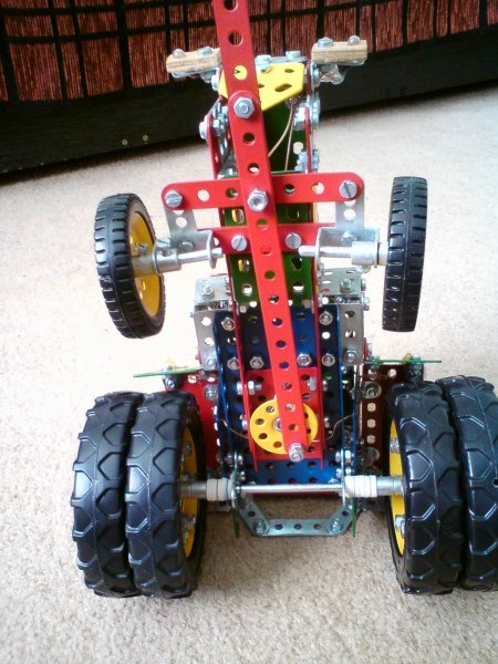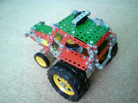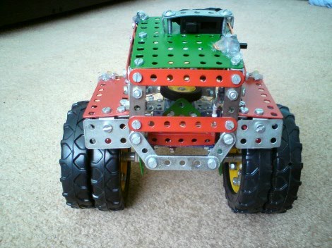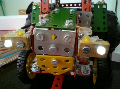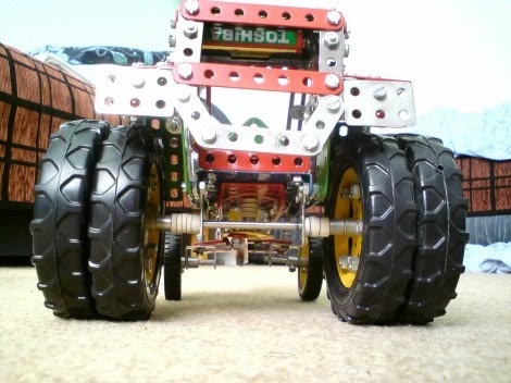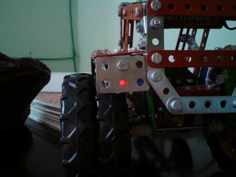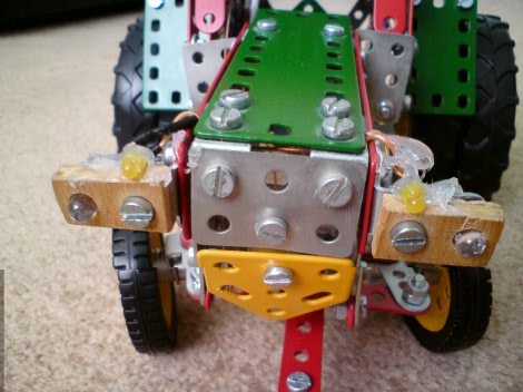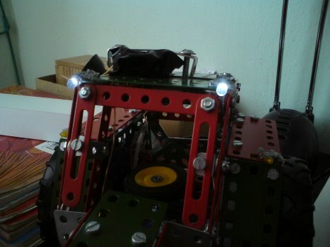 Toto je traktor postavení z merkúru 006, na ktorom je množstvo vylepšení, napr. zdvojené kolesá alebo svetlá. Svetlá funguju ako na normálnom aute. Traktor má obrysové svetlá: 2 červené vzadu a 2 žlté na blatníkoch a 2 žlté vpredu. Ďalej má stretávacie vpredu, a diaľkové na streche . Obrysové svietia stále a dajú sa zapínať stretávacie alebo diaľkové. Na stretávacie svetla som použil ledky biele na 3,3V 15° 23000mcd ,a na dialkové 3,3V 8° 72000mcd.