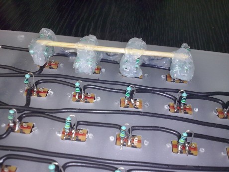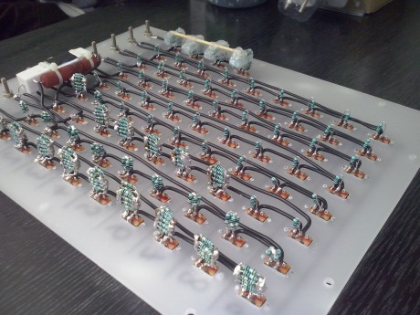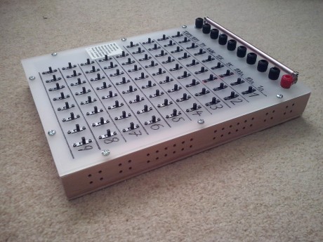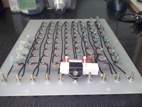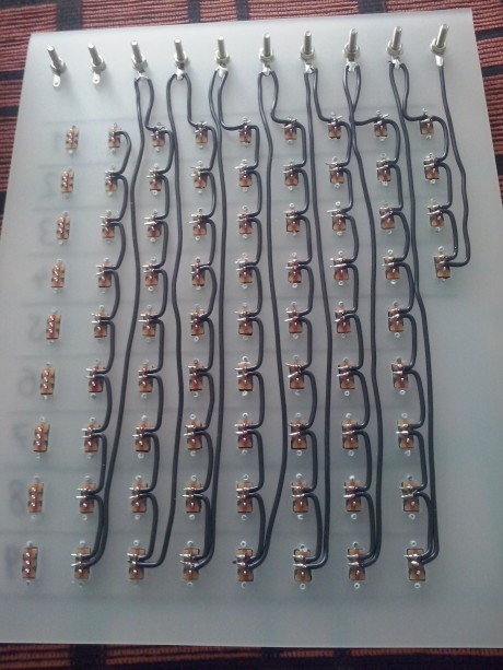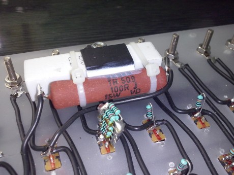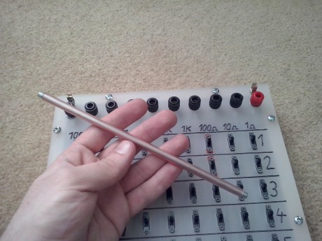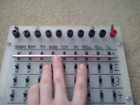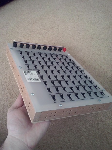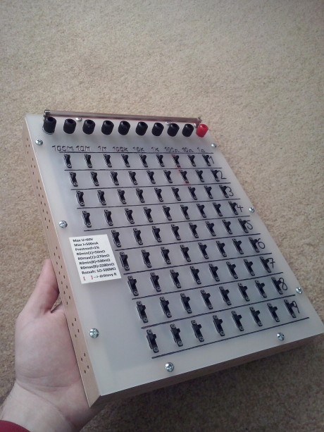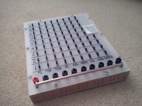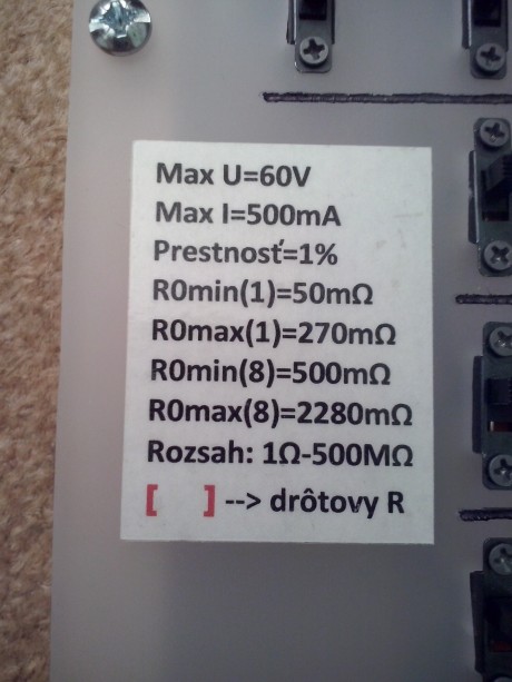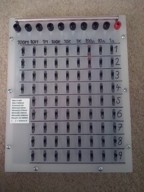 Táto odporová dekáda je robená pomoci zapojenia rezistorov určitých hodnôt do série, ktoré sú skratované vypínačmi. Ktorý rezistor chceme zaradit do obvodu tak jeho vypínač vypneme. Medzi určitými radmi hodnôt rezistorov su zdierky zapojene. Rady sú tvorené 1Ω,10Ω,100Ω,1KΩ,10KΩ,100KΩ,1MΩ,10MΩ a 100MΩ rezistormi. Rezistory su tvorené, zapájané a stavané podla výpočtov, viď subor nižšie. Taktiež v súbore su uvedené odchylky,výkonová zatažitelnosť a teda aj max napätie a max prúd. Tiež je tam uvedený R0 (odpor zopnutých vypínačov v serií), označujem ho ako min(jaky som nameral) a max (aký výrobca udáva maximalný odpor). V zátvorkách uvádzam na koľko radov to je počítané. Prestnosť je 1% na všetkých rezistoroch a na celej kaskáde sú 2 rezistory drôtové ostatné sú metalizované. Ako základná doska bolo použité matné plexisklo hrúbky 4mm. Tyčka v držiaku slúži na rýchle zopnutie všetkých výpínačov (teda vyradenie všetkých rezistorov pre dalšie meranie) a kontrolu vypínačov. Krabička je z drevenných líšt šírky 3cm a sú prevŕtané 4mm vrtákom pre dobré chladenie rezistorov. Spodok je z preglejky a všetko je lakované. Potlač je spravená so spájkovačkou a centrofixkou.