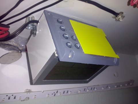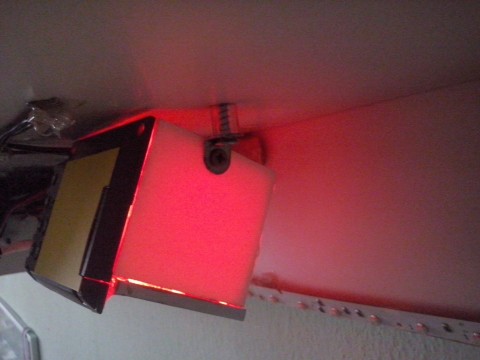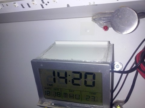 Pôvodné hodiny som kúpil z GM-electronic. Rozrobil som ich, odlepil som odrážacu fóliu zo zadnej strany displeja a nalepil som tam obyčajný papier, displej som zalepil tavným lepidlom o 90 stupnou doprava do pôvodného rámiku ktorý som upravil, narezal som z plastovej dosky ďalšie steny pre vytvorenie kvádra. Na stenu oproti displeju som nalepil led pásik dlhý 5 cm červenej farby. Celé som to uzavrel poslednou stenou, namontoval do poličky nad postelou a spravil tlačítko pre napájanie led pásiku.