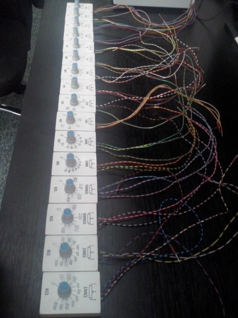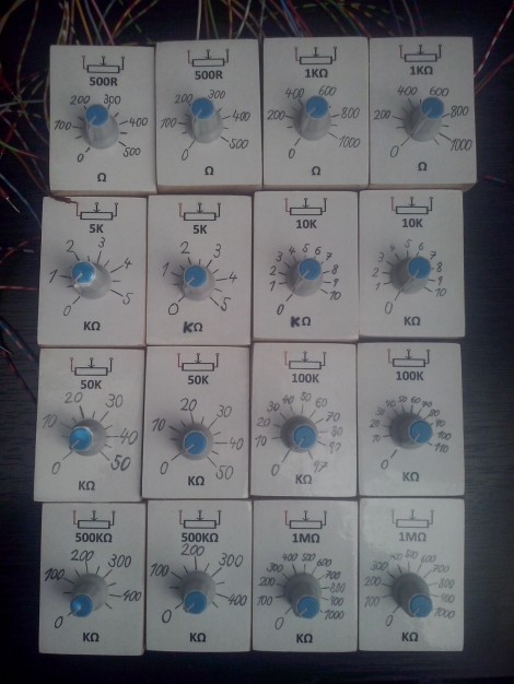 Sú vhodné pri oživovaní a skúšaní obvodov v kontaktnom poli. Skladajú sa s drevennej základne, obyčajného potenciometru s vyvedenými vodičmi, ktoré sú zakončené pocinovanými pinmi. Na vrchu základne je urobená stupnica, ociachovaná podľa ohmetra. Urobil som si takú sadu 16 kusov v ktorej je 8 hodnôt po dva kusy.