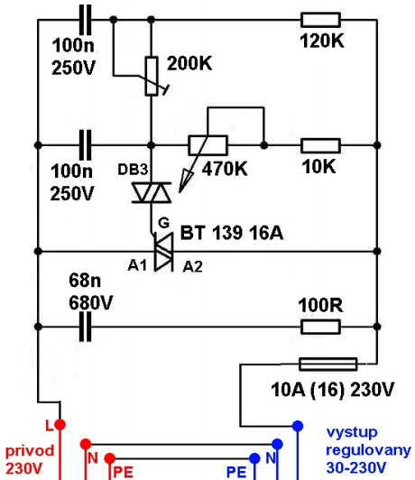 Tento triakový regulátor dokáže regulovať 230V striedavých v rozmedzi 30-230V a to pri prúde až 16A. Preto uvádzam v zátvorke tých 16A lebo poistku som zvolil 10A lebo aj tých 10A postačuje pre takmer všetký spotrebiče. Keby bolo potrebné regulovať až 16A tak stačí poistku vymenit za 16 ampérovu. Dajú sa s ním regulovat napr. výhrevné telesa,žiarovky,motory (nie kondenzátorove), transformátory a iné spotrebiče. Schéma zapojenia je dole, cesticky plošného spoja musia byť široké a dobre zaliate cínom pre vätčší prierez. Potenciometer môže byť otočný alebo posuvný, ale podmienkou je, že musí mať hriadeľku/bežec umelý. Ja som zvolil posuvný. Na triak primontujeme chladič a krabička musí byť vetraná. Pri práci si dávame pozor lebo pracujeme s obvodom ktorého napätie je nebezpečné.